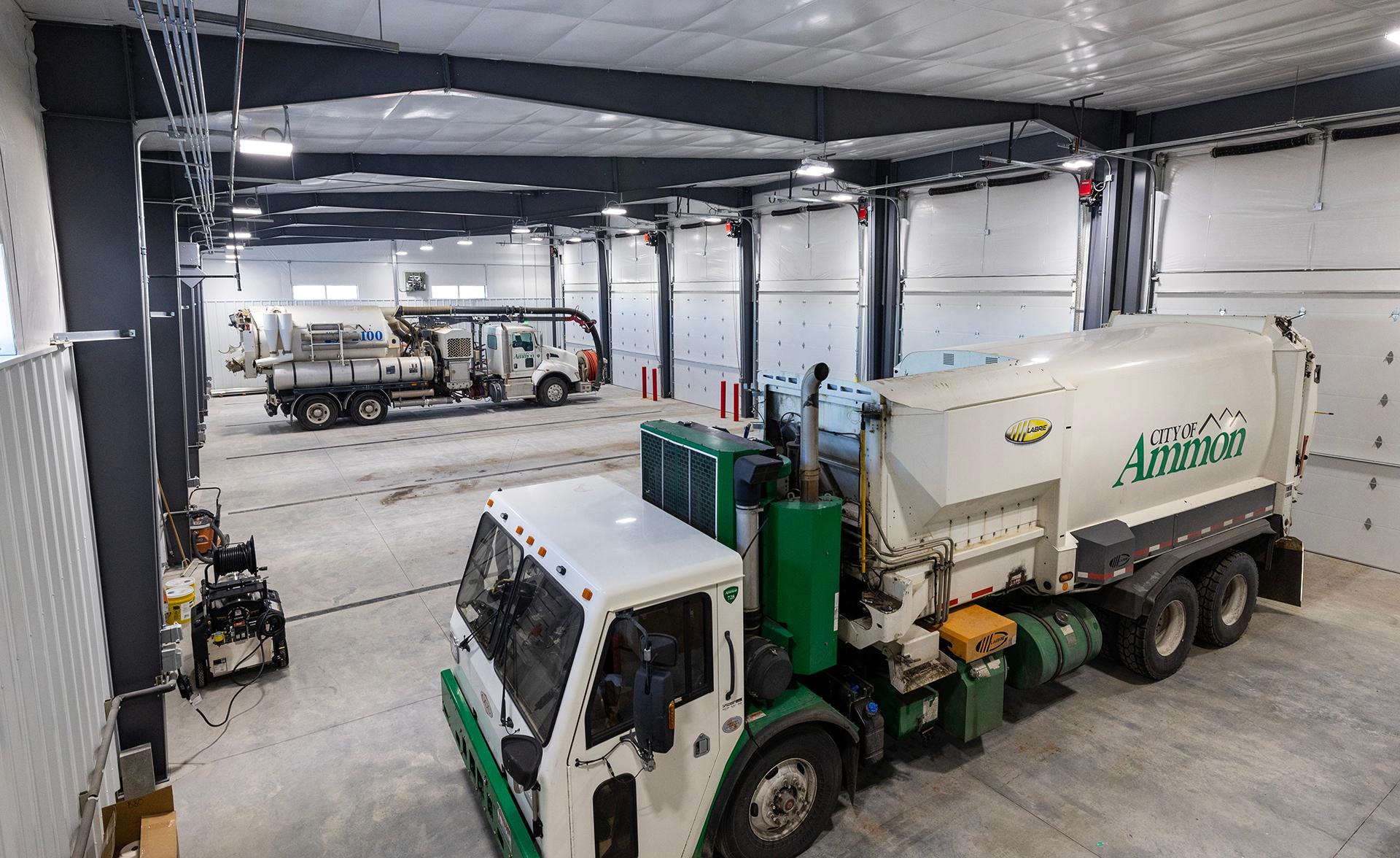 The City of Ammon Sanitation building project was for construction of a new 6,500 square foot public works support structure, primarily for the storage of City sanitation trucks. This structure is a single slope pre-engineered metal building (PEMB) with numerous truck doors on the high side. The six-bay building includes a shared office with multiple workstations, storage on the main floor and mezzanine, and a utility room. This new building will aid the municipality in its mission to serve the community.