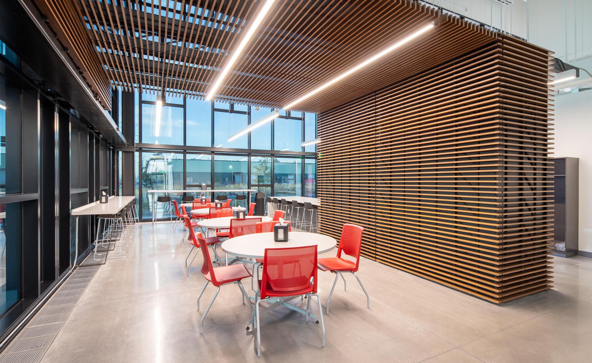 This two-story building is a steel-frame structure finished with metal panels and dynamic curtainwall glazing. Interior spaces include four high-ceiling bays with full motion simulators, four procedure trainers, seven classrooms, ten briefing rooms, offices, a conference room, and a café. Finishes are all high-end, consistent with the Delta brand, and executed at the highest quality and attention to detail. Exterior scope included utility coordination, site paving, landscaping, etc. This facility significantly enhances Delta’s training capabilities, providing easier access for pilots based in the western U.S.