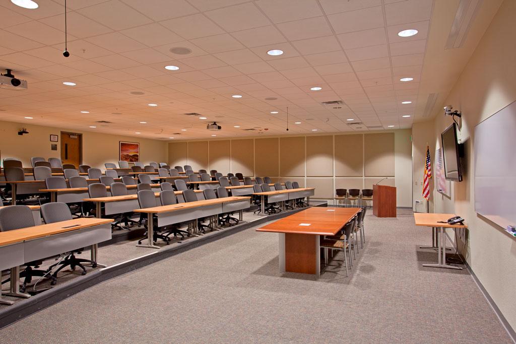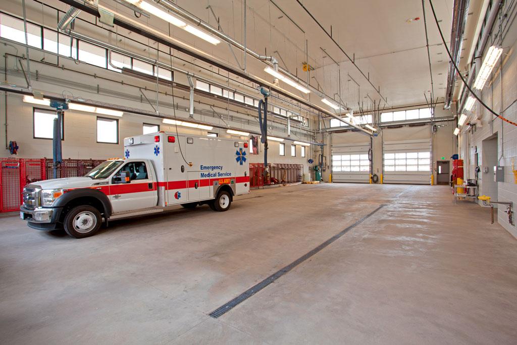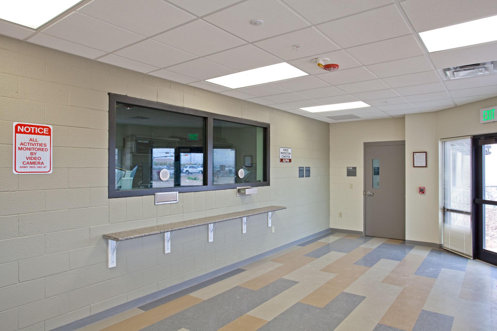 The Consolidated Fire, Safety and Security building is a new, LEED Silver certified emergency services center with consolidated dispatch and emergency response systems for both the fire station and military police. The Police Station includes a detention area with two holding cells, two isolation cells, three Army Standard D cells, breathalyzer rooms, interview rooms, and a booking room. The lobby is protected by bulletproof glass and the building is surrounded by a six-foot-tall chain link fence with barbed wire to secure the vehicular sally port for prisoner transfer, military police vehicle parking, and tactical equipment storage areas. The Fire Station includes an apparatus bay, living quarters, Station Chief offices, fire station support, and office and meeting space for the Directorate of Emergency Services and Military Administration. A 100-person training room is shared by the departments within the facility. The project also included an exterior tactical vehicle storage area and uninterruptible power supply units to protect critical functions, with a standby diesel generator and a redundant communication system.