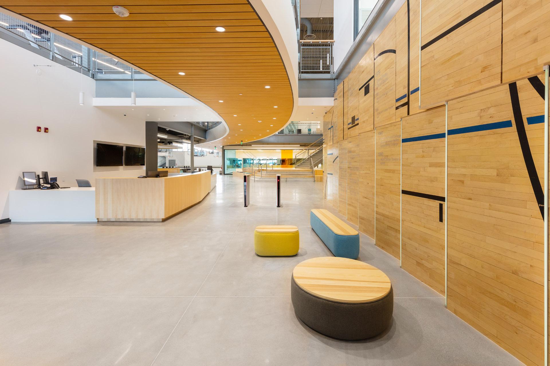- DescriptionThe Orem Family Fitness Center project was an expansion (99,600-sf) and renovation (32,320-sf ) that completely transformed the City’s outdated Community Center. The revitalized Center is a state-of-the-art facility featuring innovative fitness design. A modern, open design concept allows for every fitness discipline, childcare, indoor playground, locker rooms and access to the pools to be visible and accessible from the main lobby. The expansion created space for an elevated running track, racquetball courts, workout equipment and studios, multipurpose rooms, family changing suites, locker rooms, child daycare and a one-of-a-kind indoor playground / kid fitness gym, teen lounge, and bouldering wall. The renovation scope included upgrades to the indoor swimming pool area, complete with spectator viewing areas, and included new equipment, HVAC system, and a new hot tub and steam room. A distinctive project feature is the timeline wall in the lobby area which was created by repurposing the wood gym floor from the old fitness center as a re-imagined, articulated wall element with a history of the city of Orem.