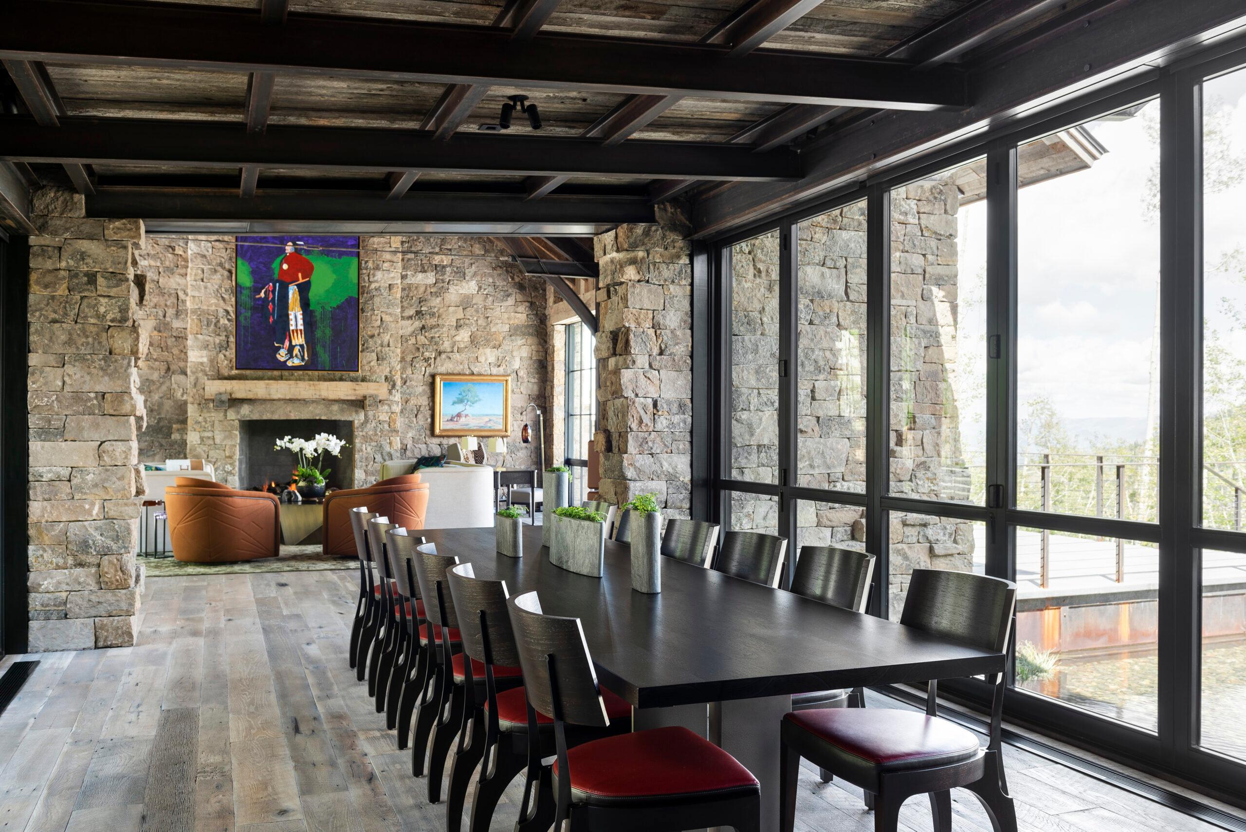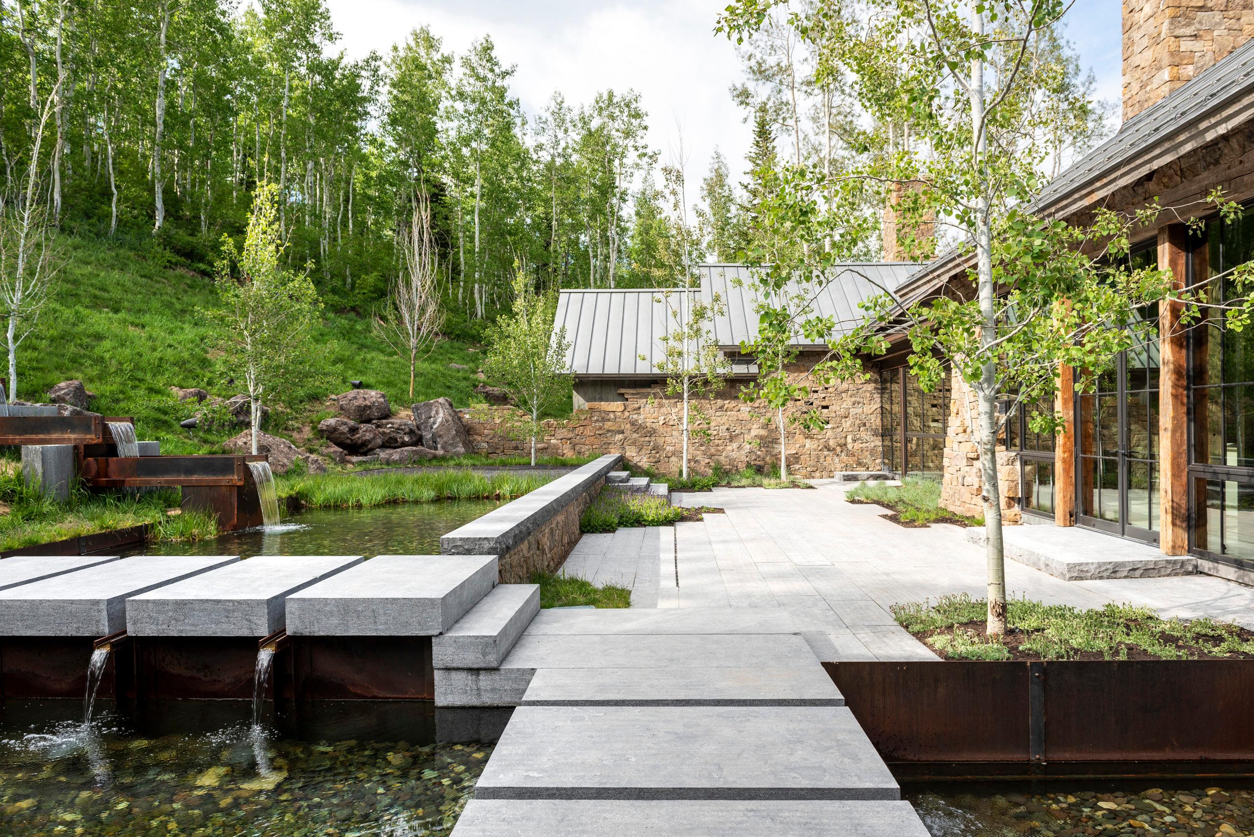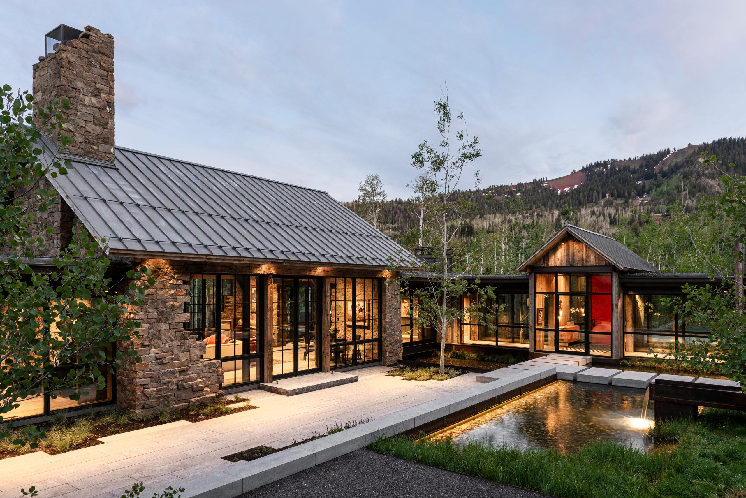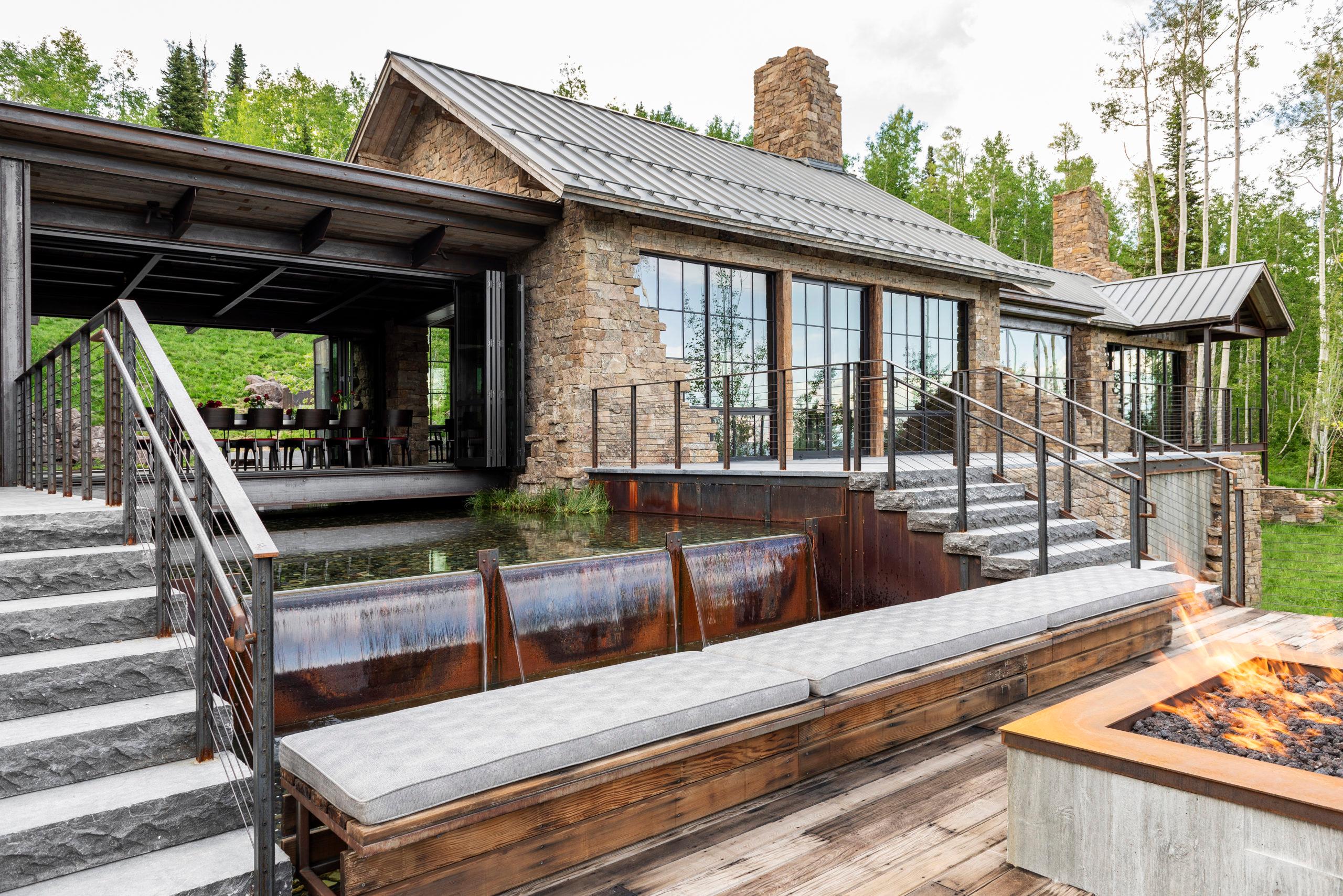 This hillside Park City house is grounded in century-old Western history evoked through rustic reclaimed corral board siding, two-foot-thick Montana moss rock walls strategically deconstructed as tumbled “ruins” and a homesteader-like cluster of structures. Contemporary expanses of glass and steel connect timber and stone forms and invite nature, capturing high-country panoramas and the sounds and sparkle of multiple Verdone Landscape Architects water features, including a mining sluice box-style waterfall that flows under the opens-to-the-elements dining room.