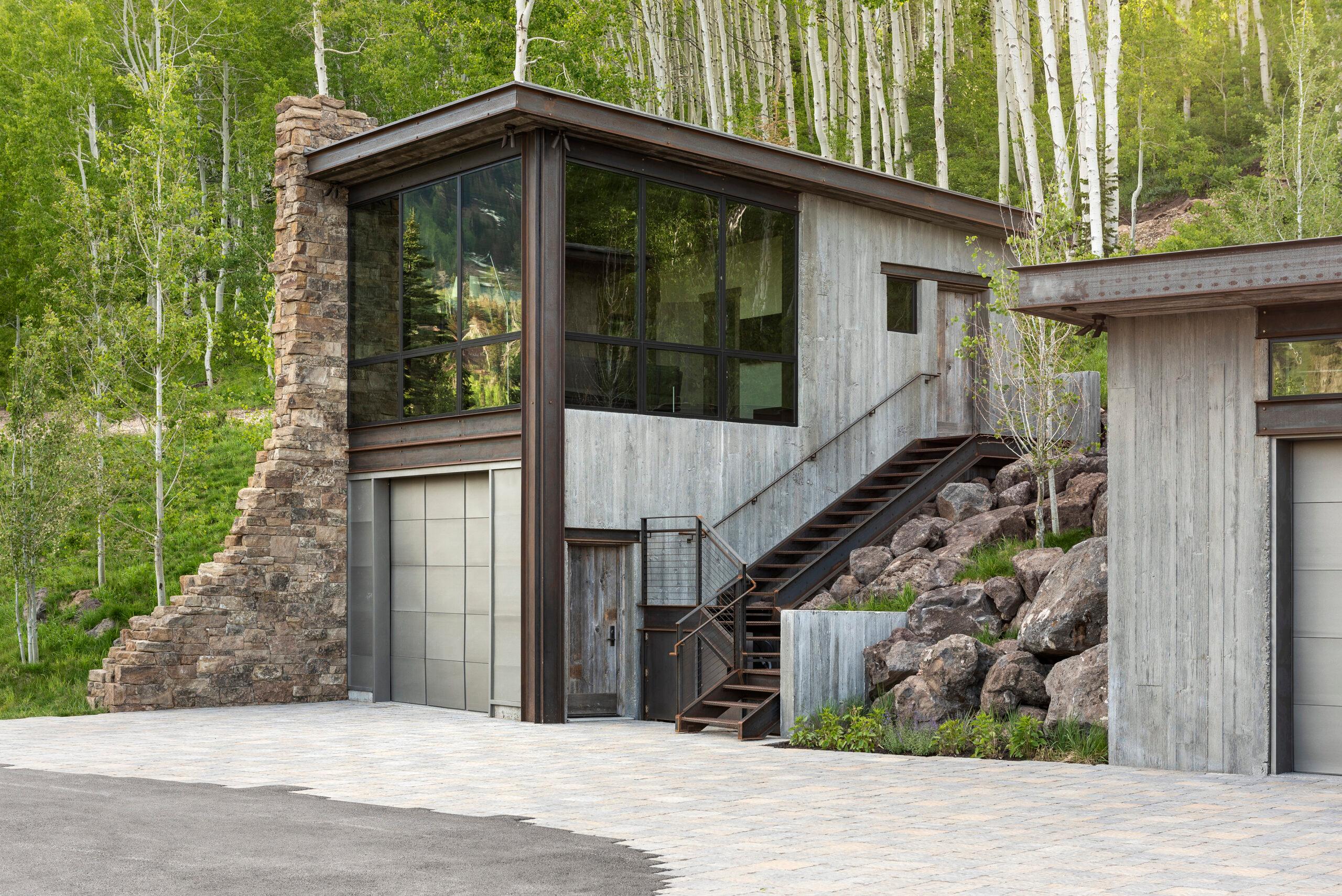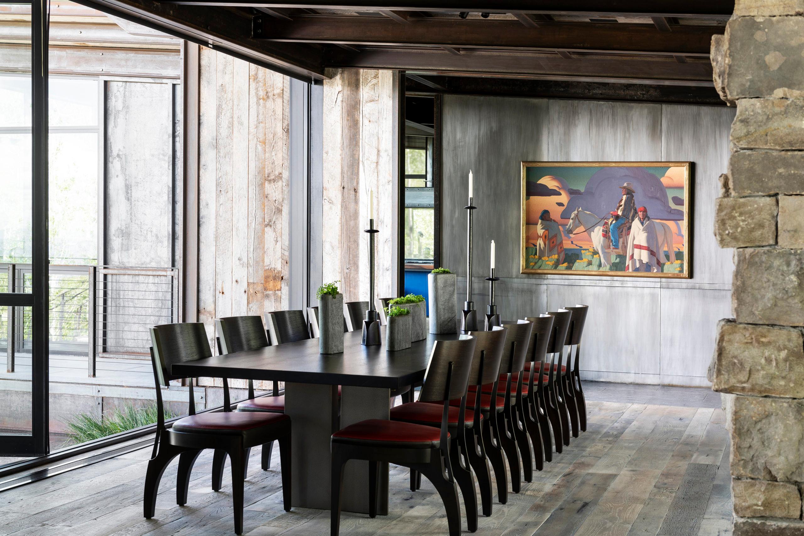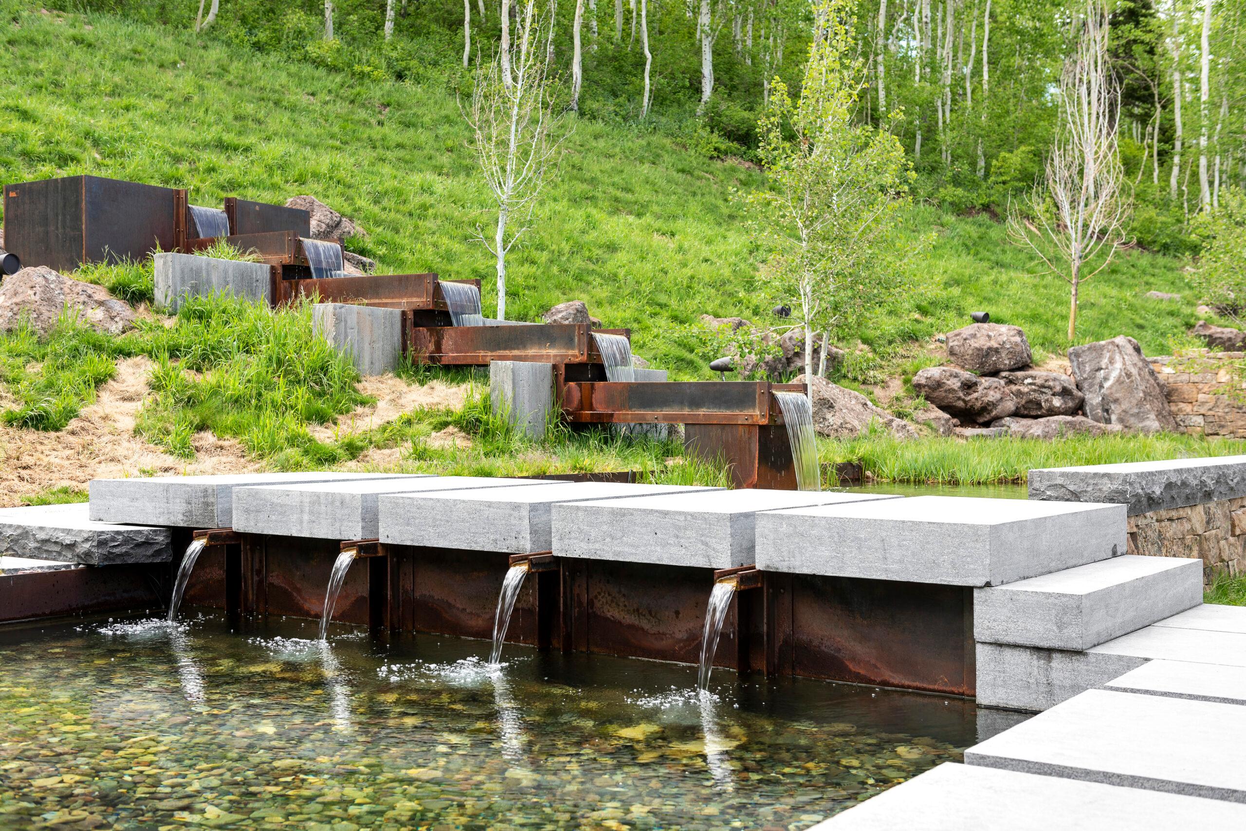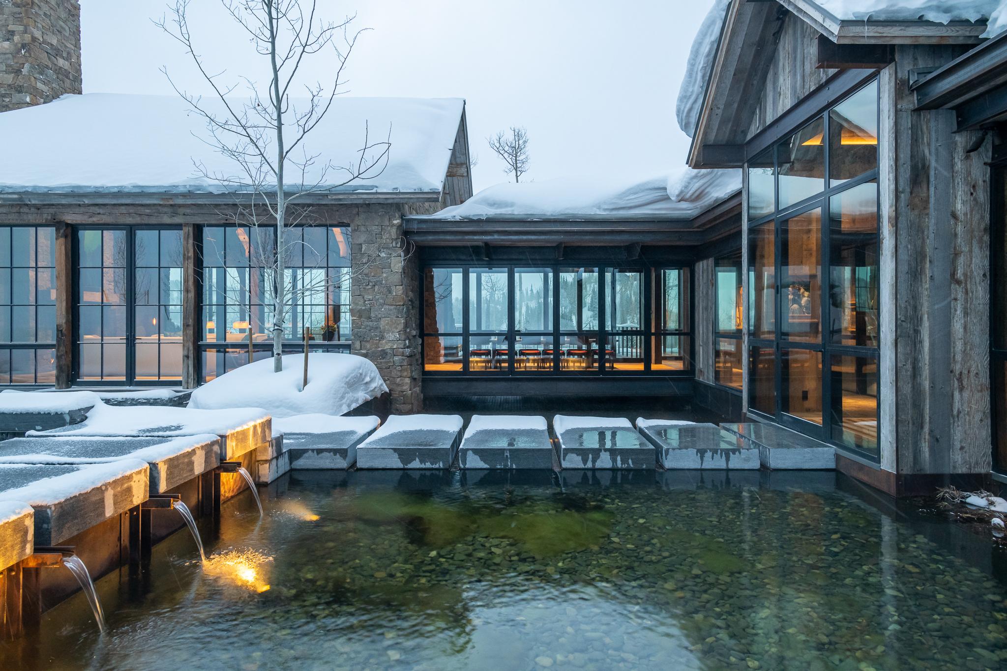 This hillside Park City house is grounded in century-old Western history evoked through rustic reclaimed corral board siding, two-foot-thick Montana moss rock walls strategically deconstructed as tumbled “ruins” and a homesteader-like cluster of structures. Contemporary expanses of glass and steel connect timber and stone forms and invite nature, capturing high-country panoramas and the sounds and sparkle of multiple Verdone Landscape Architects water features, including a mining sluice box-style waterfall that flows under the opens-to-the-elements dining room.