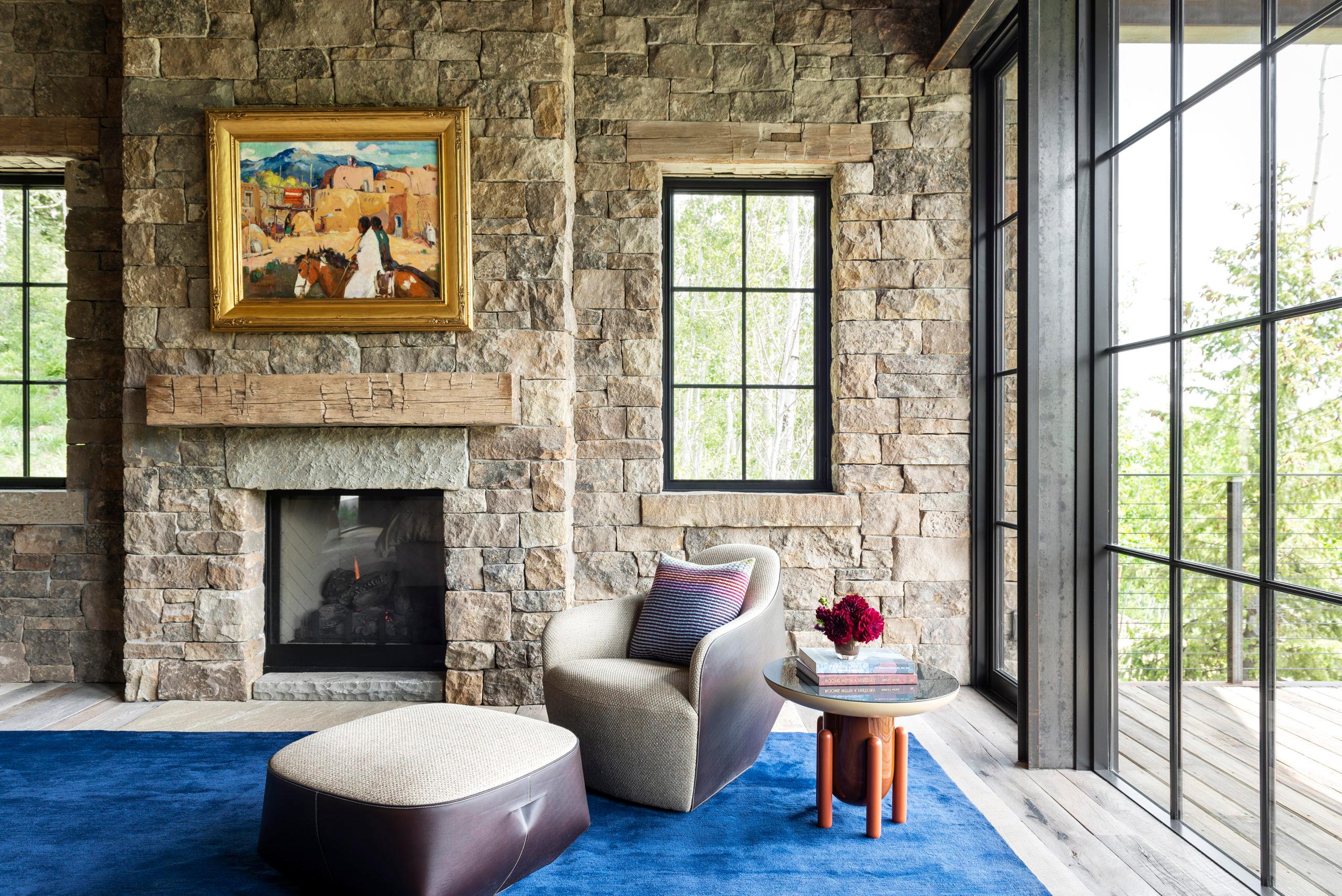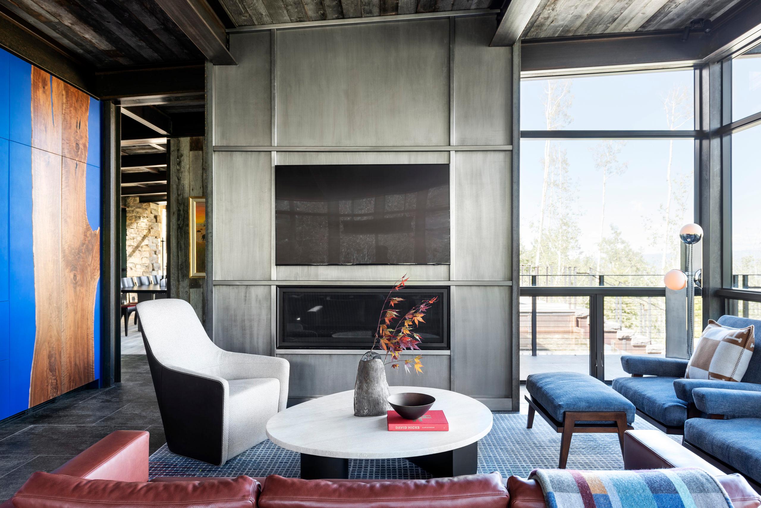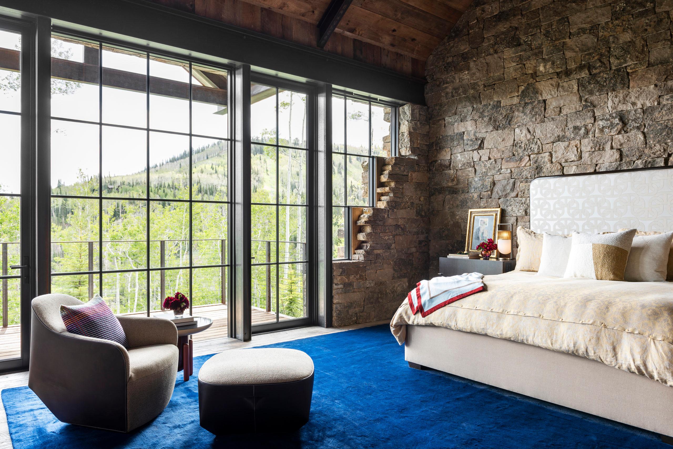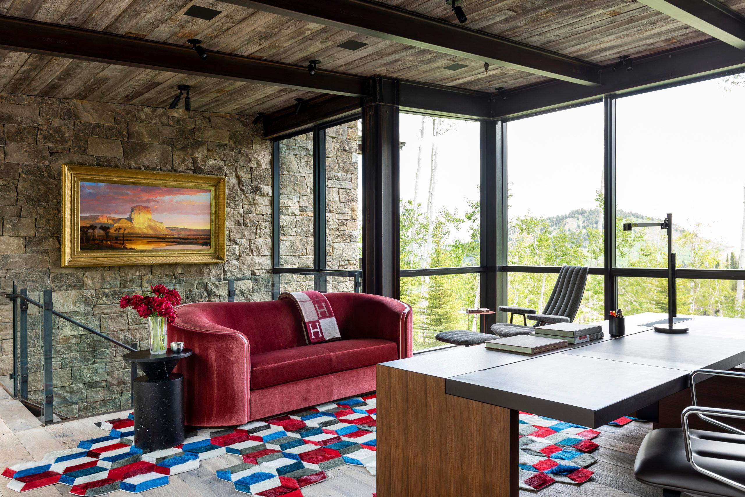 This hillside Park City house is grounded in century-old Western history evoked through rustic reclaimed corral board siding, two-foot-thick Montana moss rock walls strategically deconstructed as tumbled “ruins” and a homesteader-like cluster of structures. Contemporary expanses of glass and steel connect timber and stone forms and invite nature, capturing high-country panoramas and the sounds and sparkle of multiple Verdone Landscape Architects water features, including a mining sluice box-style waterfall that flows under the opens-to-the-elements dining room.
