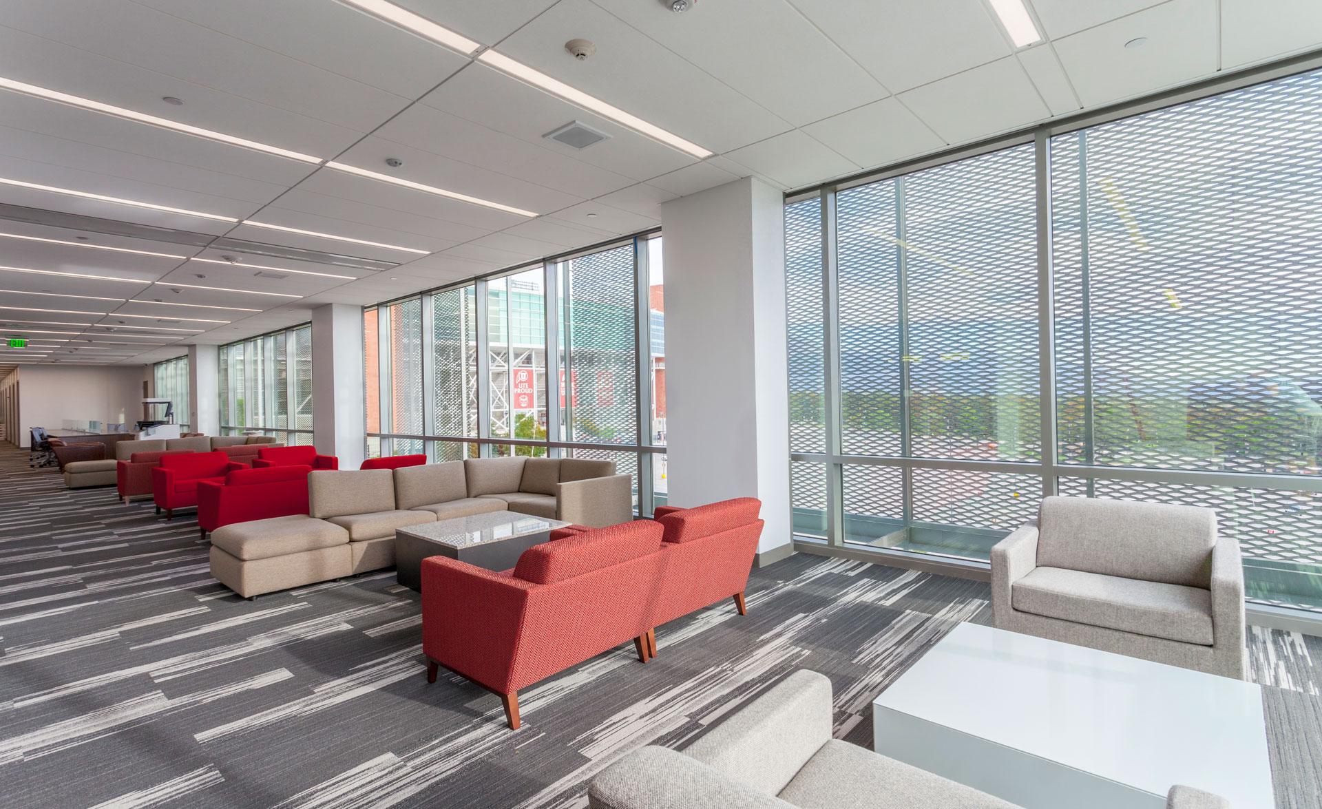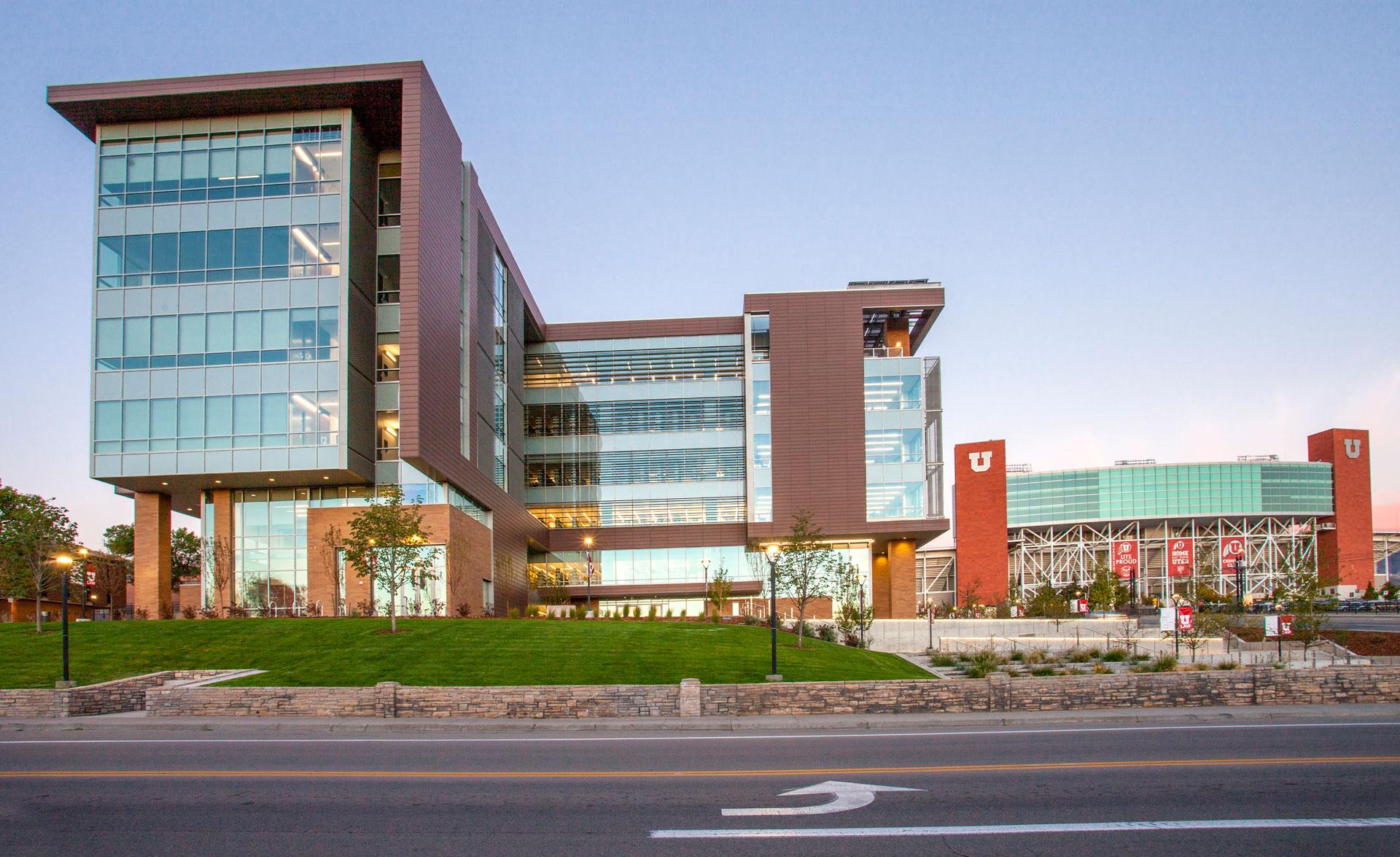 The Law School sits at a main campus entry point next to Rice-Eccles Football Stadium and across from a light-rail station, needless to say the building needed to have strong visual impact. The glass, brick, and metal exterior provide a welcoming gateway to campus visitors. The top floor features the 450-person Moot Courtroom auditorium which opens up onto a roof-top terrace.