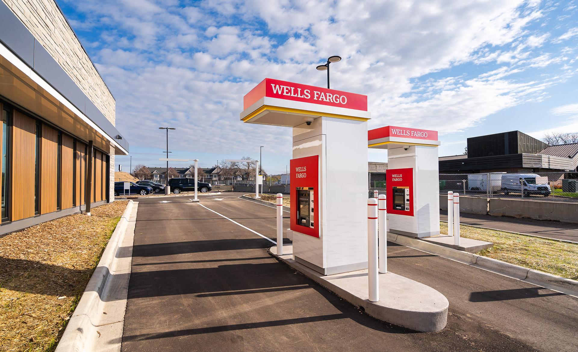 The Wells Fargo Bank branch in Golden Valley, MN is a building of steel construction with ACM metal panel and stone exterior finishes. This location of Wells Fargo was one of the first to use their new modern shell design. The original building was torn down, and the structure was moved to a different corner of the lot to make room for a multi-family housing building, The Sentinel apartments. From demolition of the original branch to the leasing of the apartments, this project will take 31 months to complete.